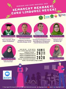 Dengan mengambil tema “Semangat Berbakti, Guru Lindungi Negeri”, Prodi PGMI gelar webinar. Menurut Ketua Prodi Ruwiah A. Buhungo, bahwa saatnya melakukan refleksi, tentang profesionalisme guru, apresiasi kepada guru, serta beragam kebijakan yang bermuara pada upaya mengembalikan kemuliaan dan martabat guru, serta tentunya kesejahteraan para guru. Profesi guru adalah mulia dan terhormat. Menjadi guru merupakan bidang pekerjaan khusus yang dilaksanakan dengan panggilan jiwa, panggilan hidup, untuk mengabdi secara tulus demi kemajuan anak bangsa.