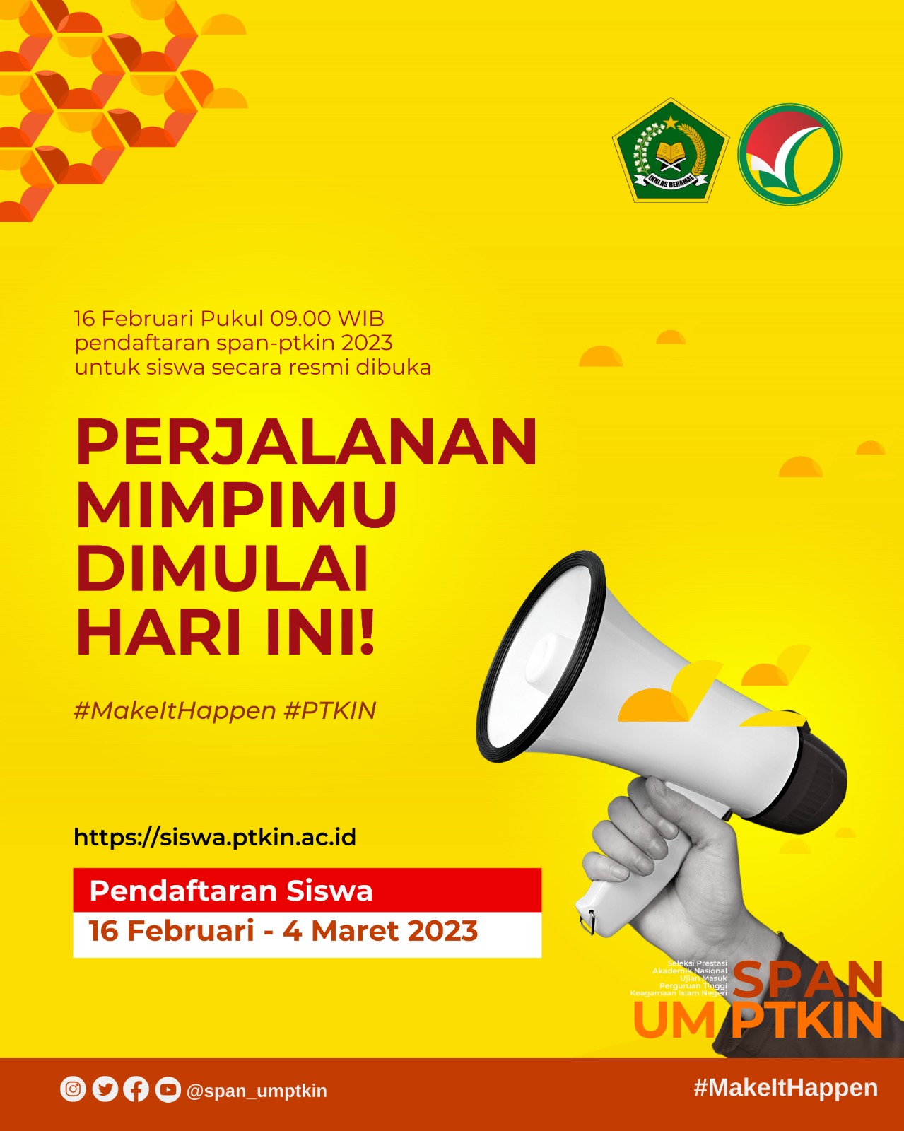 Pendaftaran siswa untuk masuk Perguruan Tinggi Keagaam Islam Negeri (PTKIN) melalui SPAN-PTKIN dibuka hari ini Kamis 16 Februari 2022. Pendaftaran SPAN-PTKIN dibuka hingga 4 Maret 2023.